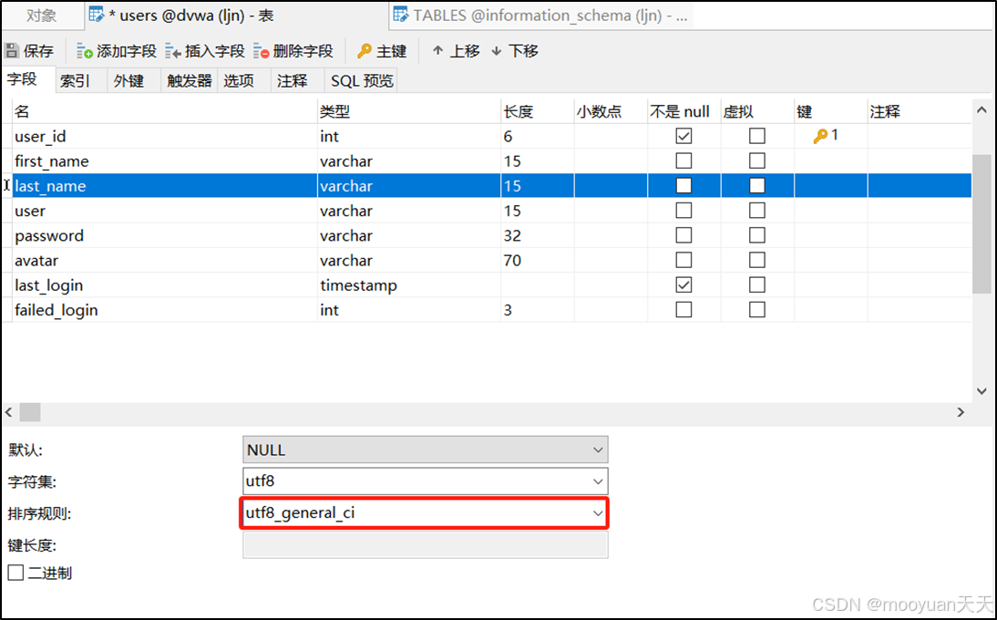 为避免使用联合注入法时报错"Illegal mix of collations for operation 'UNION'",修改dvwa数据库user表的first_name与last_name字符集,如下图所示。