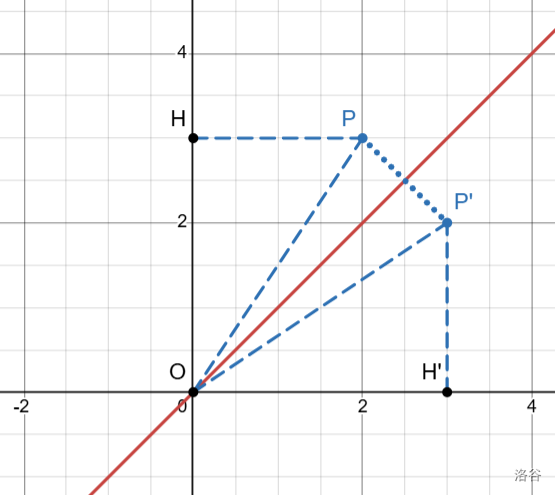 - 一个点\(P(x,y)\)关于直线\(y=x\)的对称点\(P'\)坐标设为\((y,x)\)。大家可以感性证明一下。由于比命题⑤难,这里提供一种证明:如图,点\(P\)和点\(P'\)关于直线\(y=x\)对称,立得\(y=x\)垂直平分\(PP'\)(⑥)。又得\(OP=OP'\)(⑦)。此时易证\(\triangle OPH≌\triangle OP'H'\)。由图可知\(PH=x, OH=y\),由全等可得\(PH=P'H'=x, OH=OH'=y\),则\(P'(y,x)\)。此证明可以类比延拓到第二、三、四象限的任意点\(P\)。命题得证。