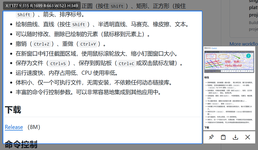 //截长图窗口只有四个控制按钮`pin,clipboard,save,close`,也是支持通过`--tool`指令控制的