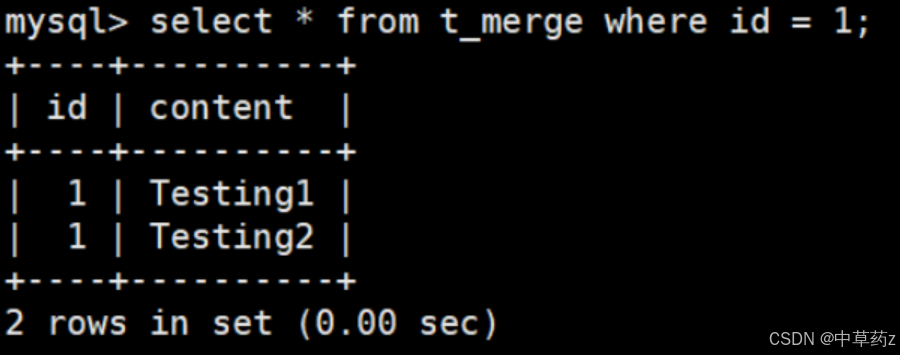 1)基础表中的 id 列作为 PRIMARY KEY 索引,但在MERGE表中并不作为主键,但是可以被索引。因为 MERGE 表不能对基础表集强制唯一性,类似的,基础表中具有 UNIQUE 索引的列可以在MERGE 表中被索引,但不能作为唯一约束,查询示例: