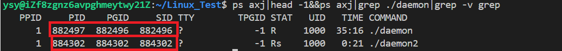 运行代码,用ps命令查看该进程,发现该进程TPGID为-1,TTY显示为?,说明该进程已经与终端去关联了。
