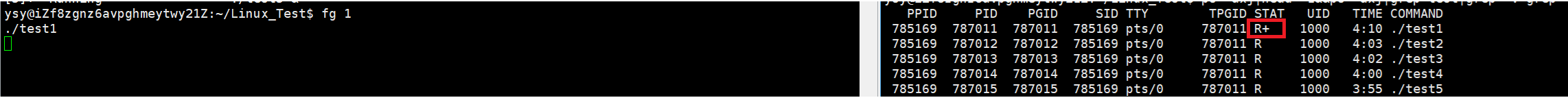 (2)fg + 作业号:可以将某个作业提至前台运行,如果该作业正在后台运行则直接提至前台运行,如果该作业处于停止状态,则给进程组的每个进程发SIGCONT信号使它继续运行并提至前台。