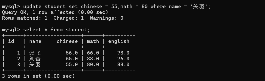 update student set chinese = 55,math = 80 where name = '关羽';