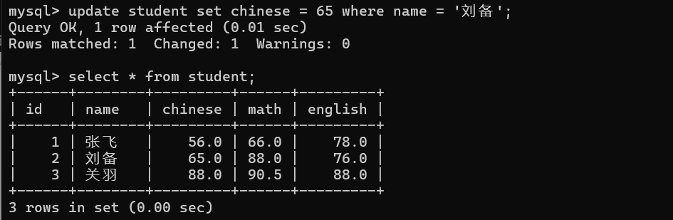 update student set chinese = 65 where name = '刘备';