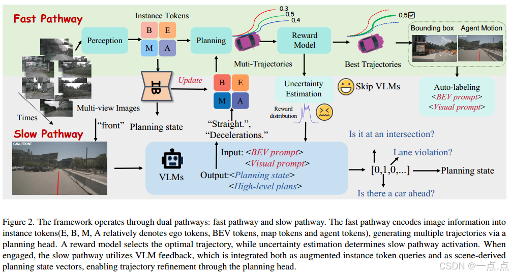 慢速路径(Slow Pathway):利用视觉语言模型(VLMs)进行复杂场景分析,生成高级元动作(如变道、停车)和规划状态。