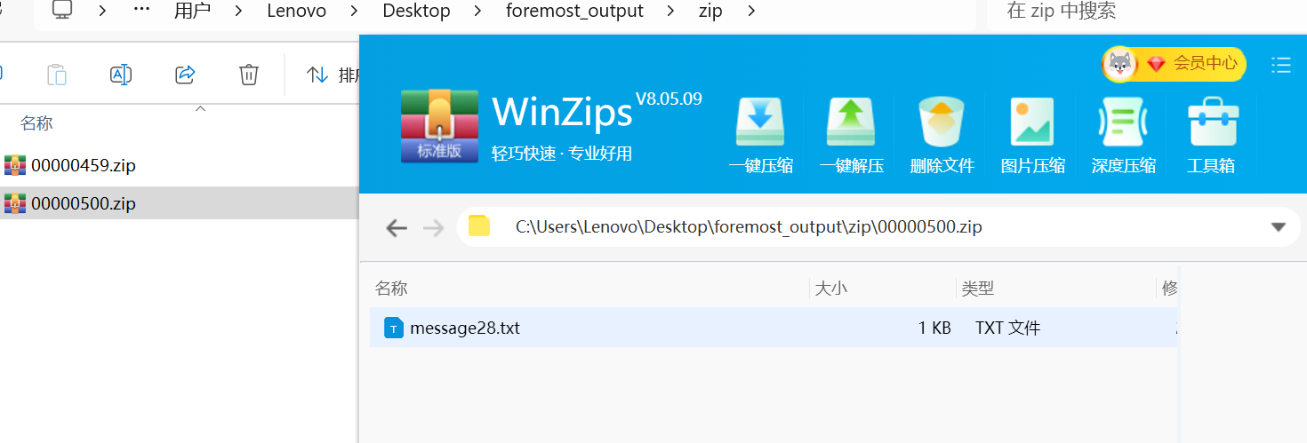# foremost -i 分离图片压缩包,然后删除所有压缩包内容为 message.txt 的,保留 message1-50.txt