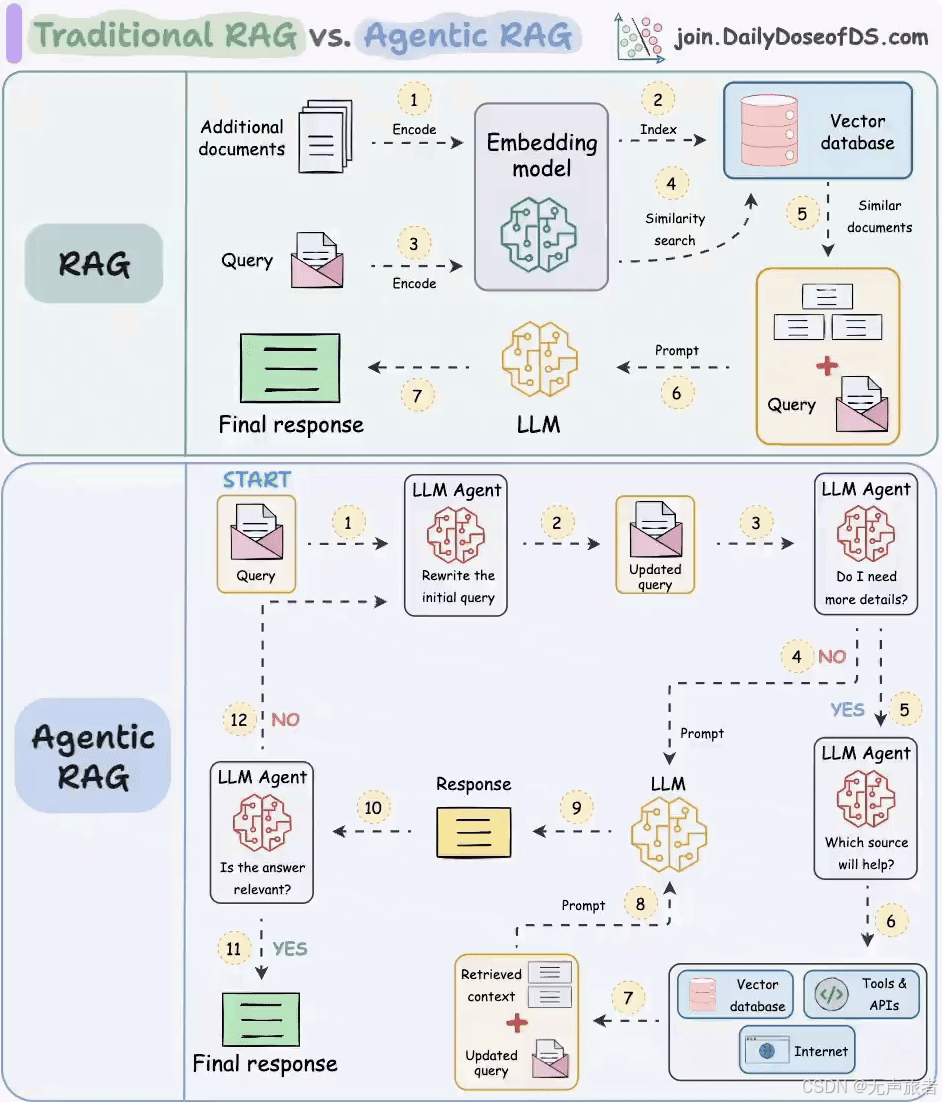 - 智能决策:Agent可以根据检索结果的置信度,决定是否需要进一步检索或直接生成回答。