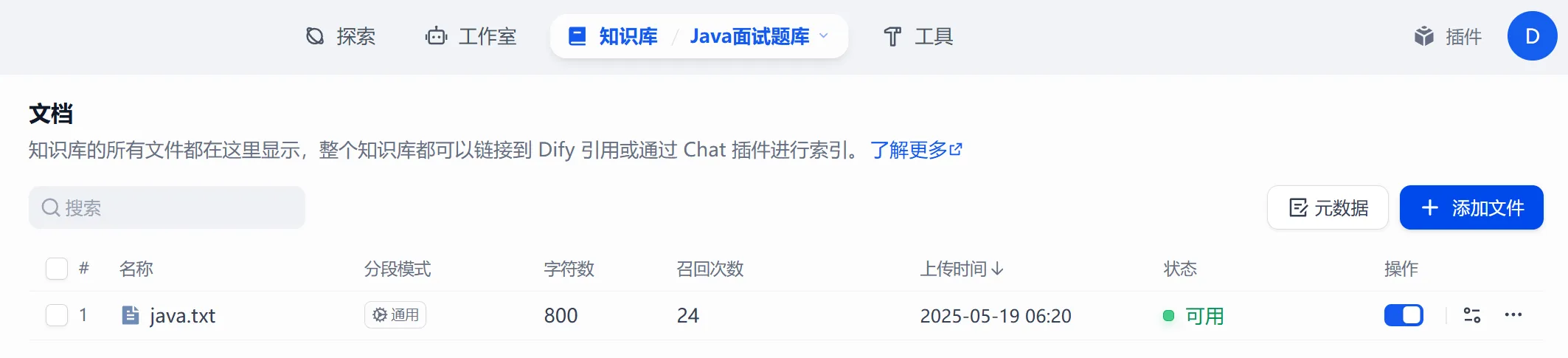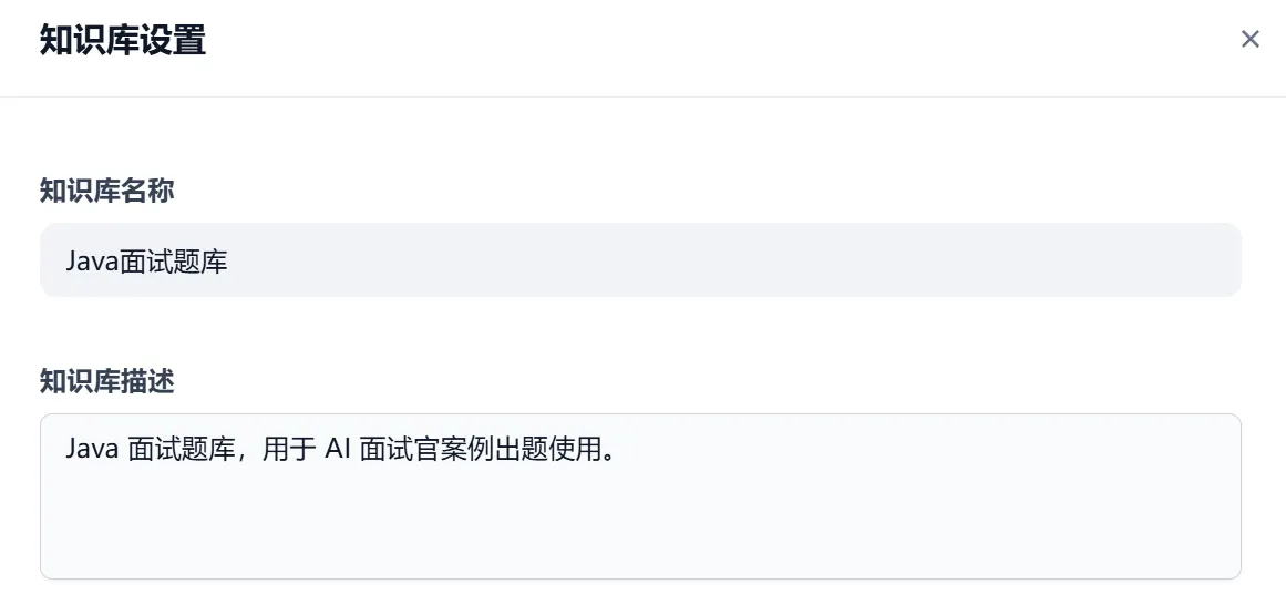 - 添加面试题知识库,设置嵌入模型以及搜索配置(搜索类型、搜索参数等)。