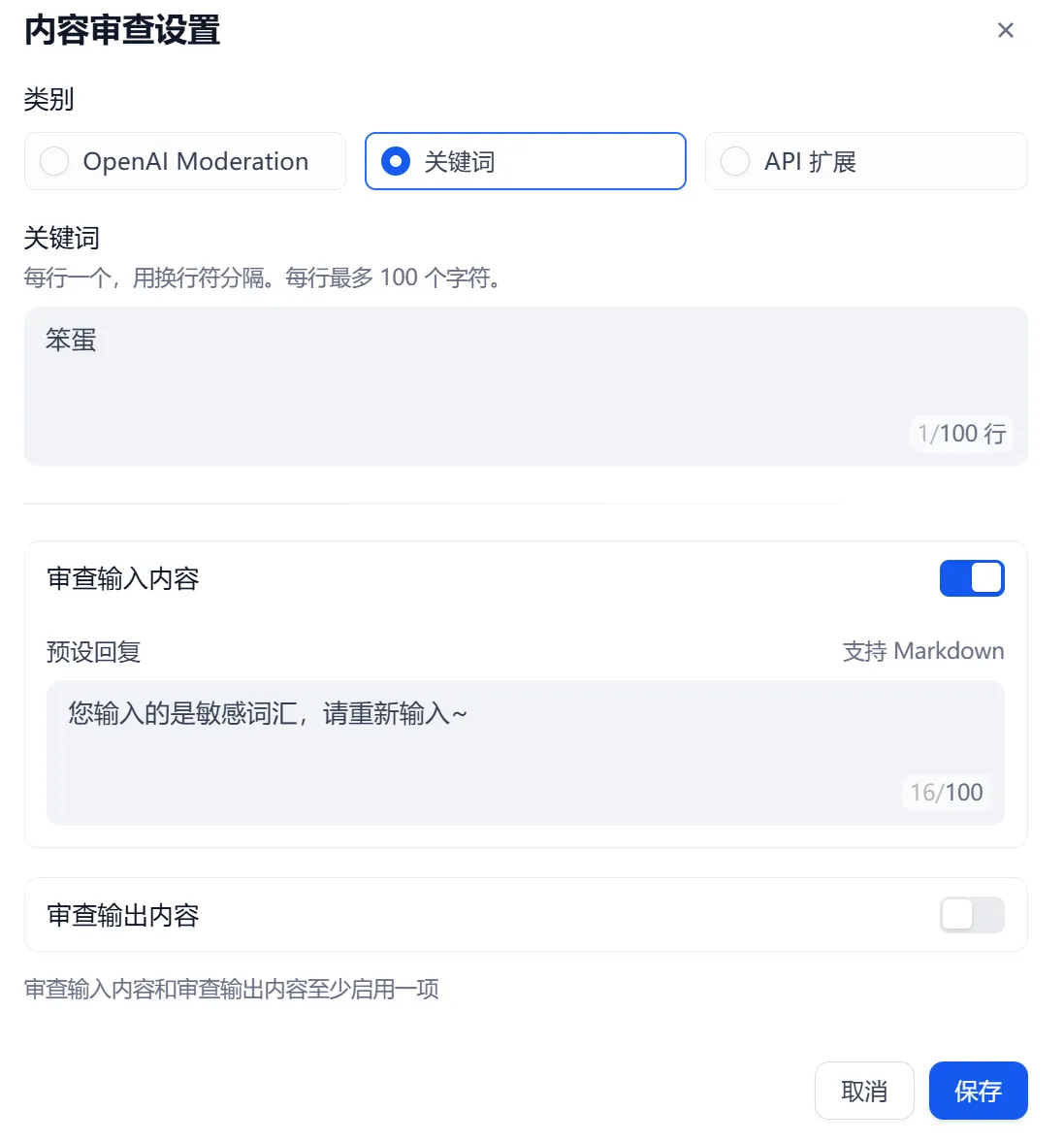 - 敏感词审查:内置 OpenAI Moderation API 及自定义关键词过滤。