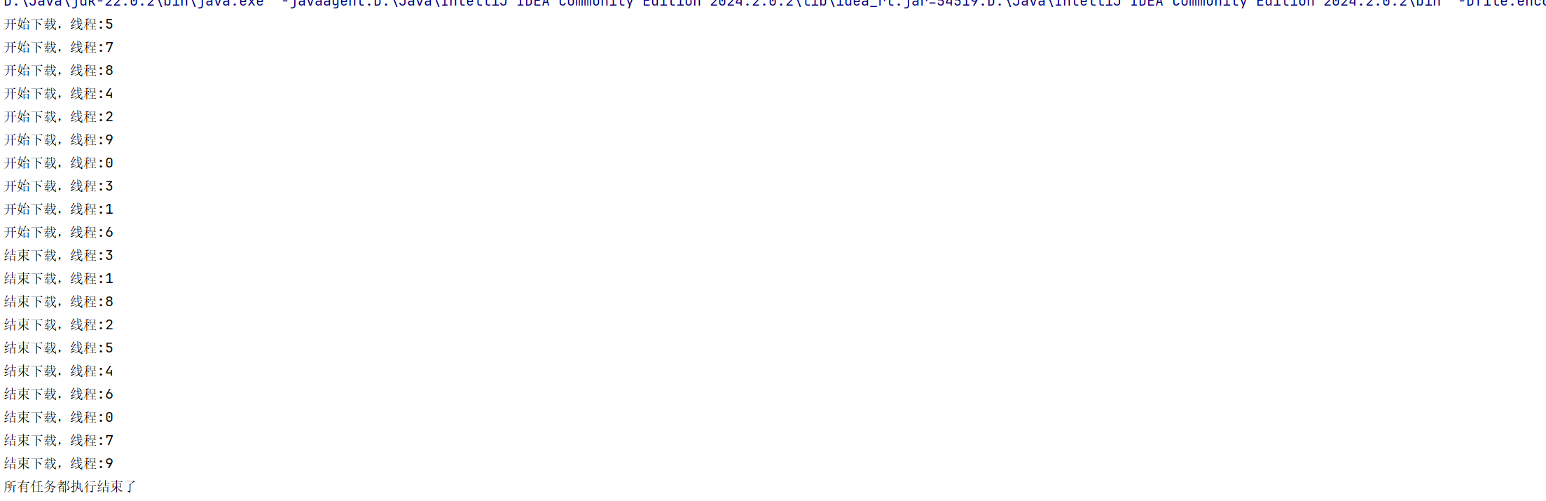 上述程序创建了10个线程并模拟进行下载任务,每个任务执行时间随机(1~5秒)。CountDownLatch的作用是让主线程等待所有10个下载线程完成后再继续执行。