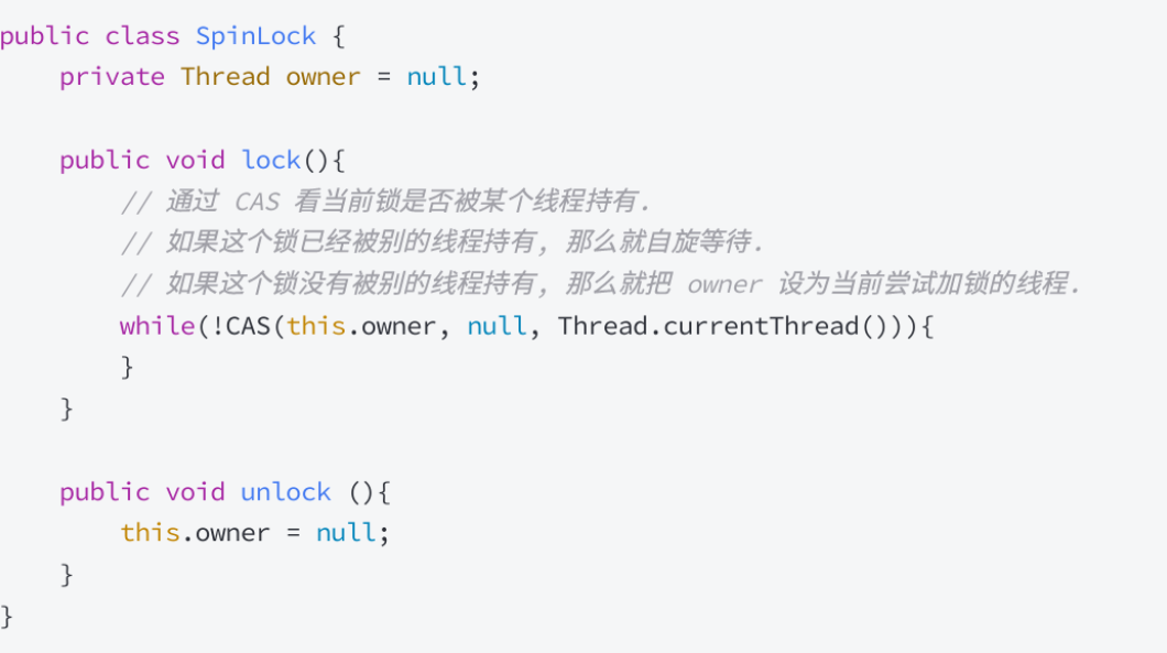 自旋锁:是轻量级锁的一种典型实现。进行加锁的时候,搭配一个while循环,如果加锁成功,循环就结束。如果加锁不成功,不是阻塞放弃CPU,而是进行下一次循环,再次尝试获取到锁。