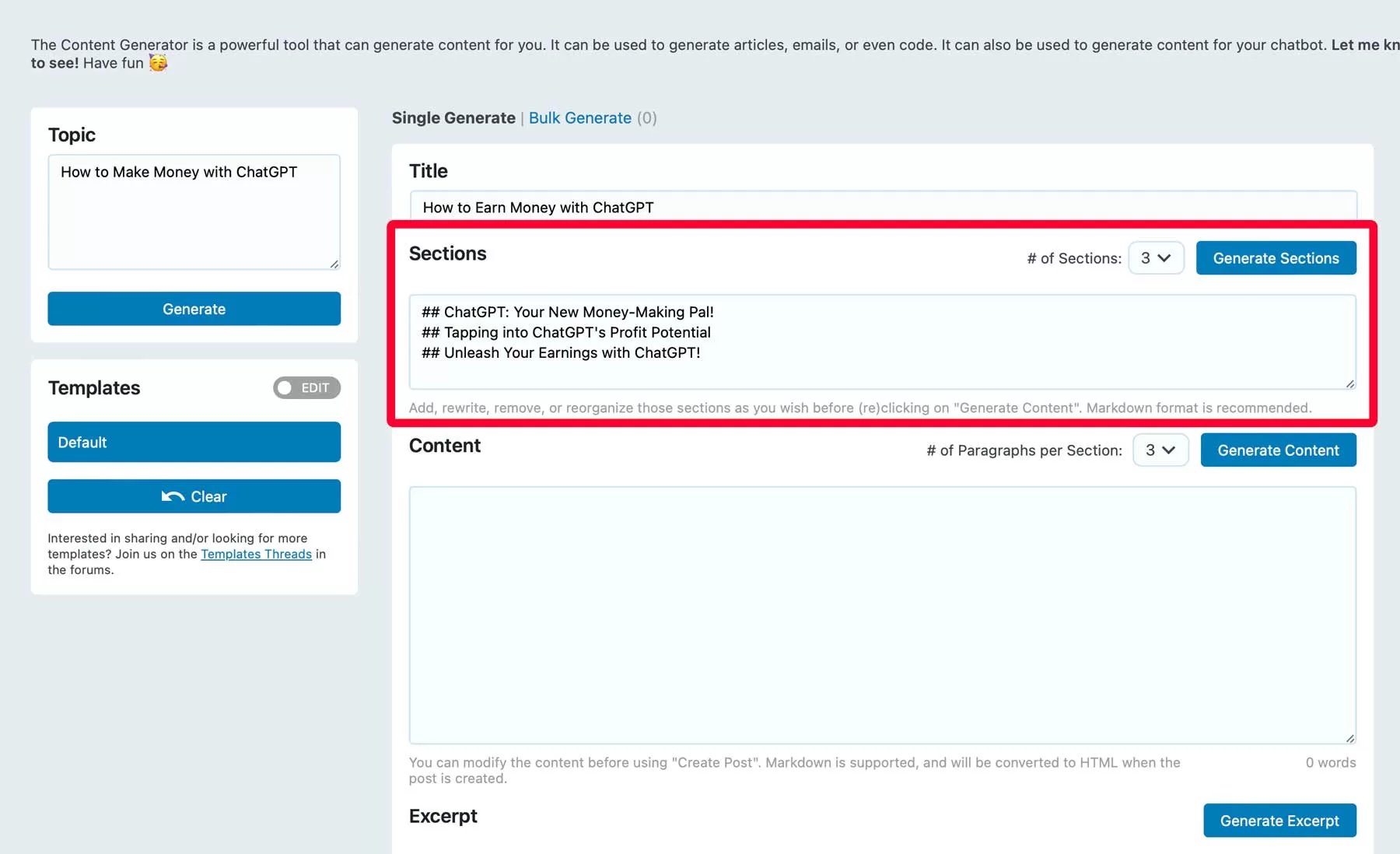 单击 "generate" 按钮后,AI Engine 将根据您输入的主题输入标题。下一步是创建章节。选择你想要的章节数量。在本教程中,我们将把版块数设置为 3。 然后点击生成版块按钮。ChatGPT 就会创建并将它们添加到页面中。