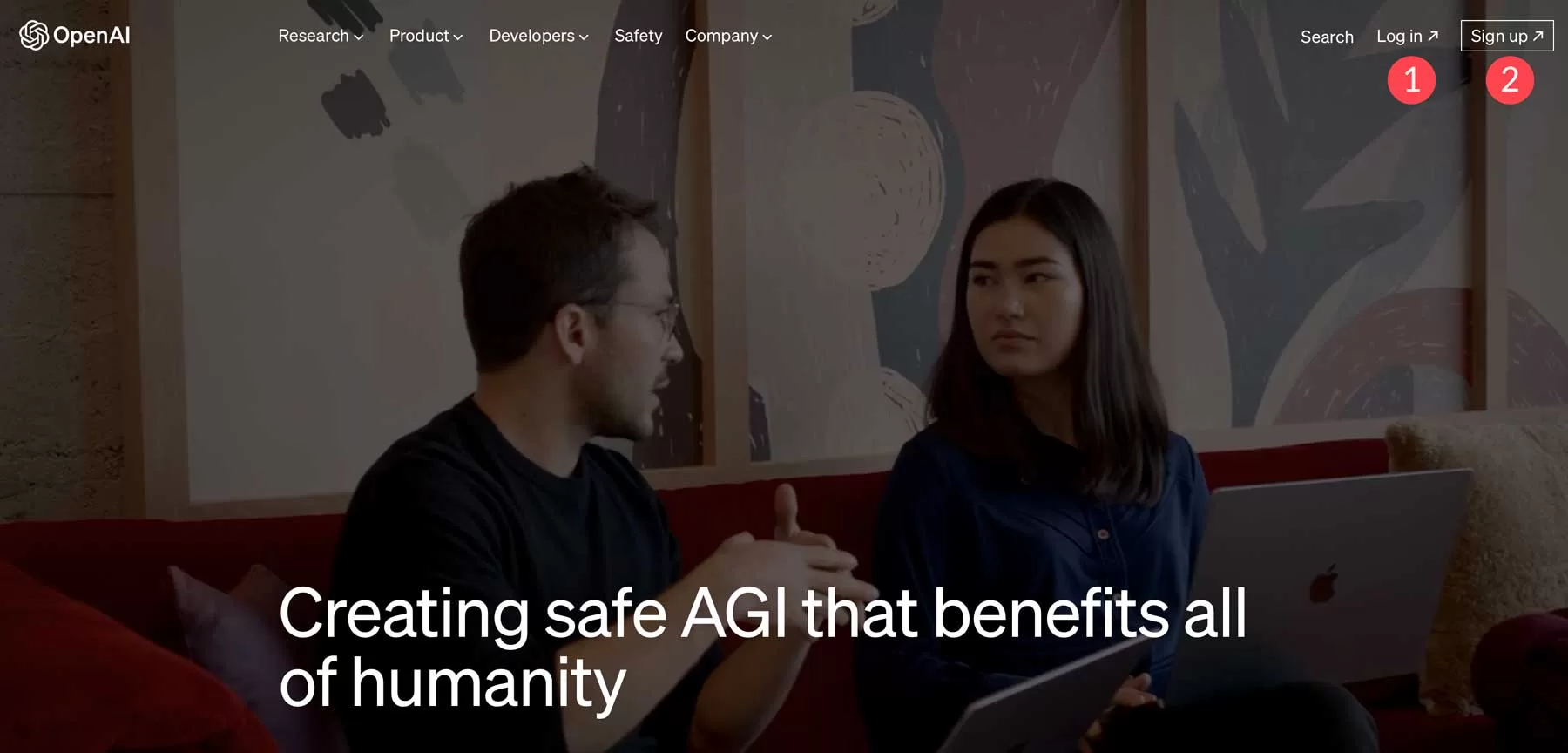 在进行下一步之前,请确保您已登录 (1) 激活的 OpenAI 帐户并已购买点数。如果您需要注册,请点击 OpenAI 网站右上方的 sign up 按钮 (2)。
