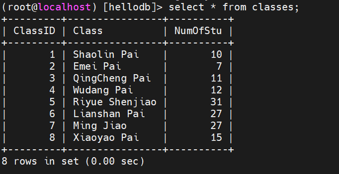 我们只想看到学生数量大于等于15的对象时,可以使用'select * from classes where numofstu>=15;'