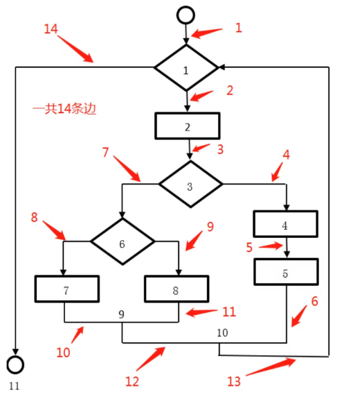 图G的环形复杂度V(G)=E-N+2,其中,E是流图中边的条数,N是结点数。