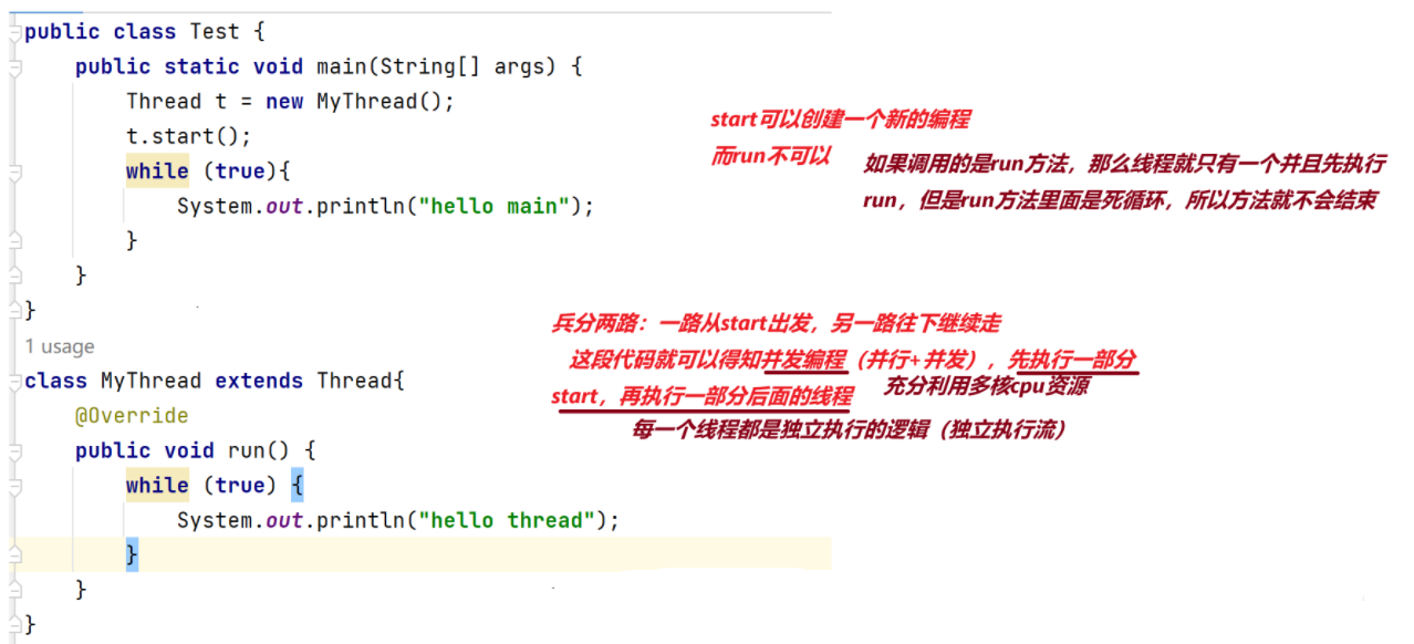 start可以创建一个新的线程,如果将start改成run,此时代码就不会创建新线程,只有主线程,这个主线程只能执行完run,才能往后继续执行。