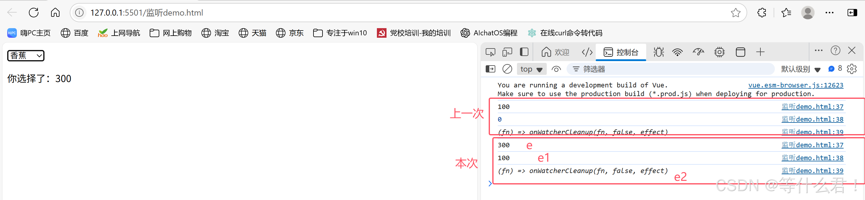 注意到watch函数监听数据是对象的属性obj.money 的变化,e,e1,e2参数分别表示obj.money当前值,上一次值,以及回调函数本身