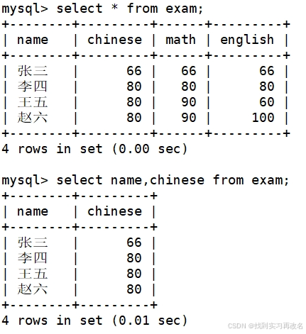 查询语句select 对表中插入数据进行查看:有全列查询与指定查询