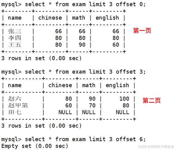查询表中数据时,不推荐直接使用 * 查询全部数据:数据有千万条,* 查询会一直刷屏查找不完,所以推荐查找时加上 limit 按找目标行下标查询想要的数据量(mysql也是从下标0开始)