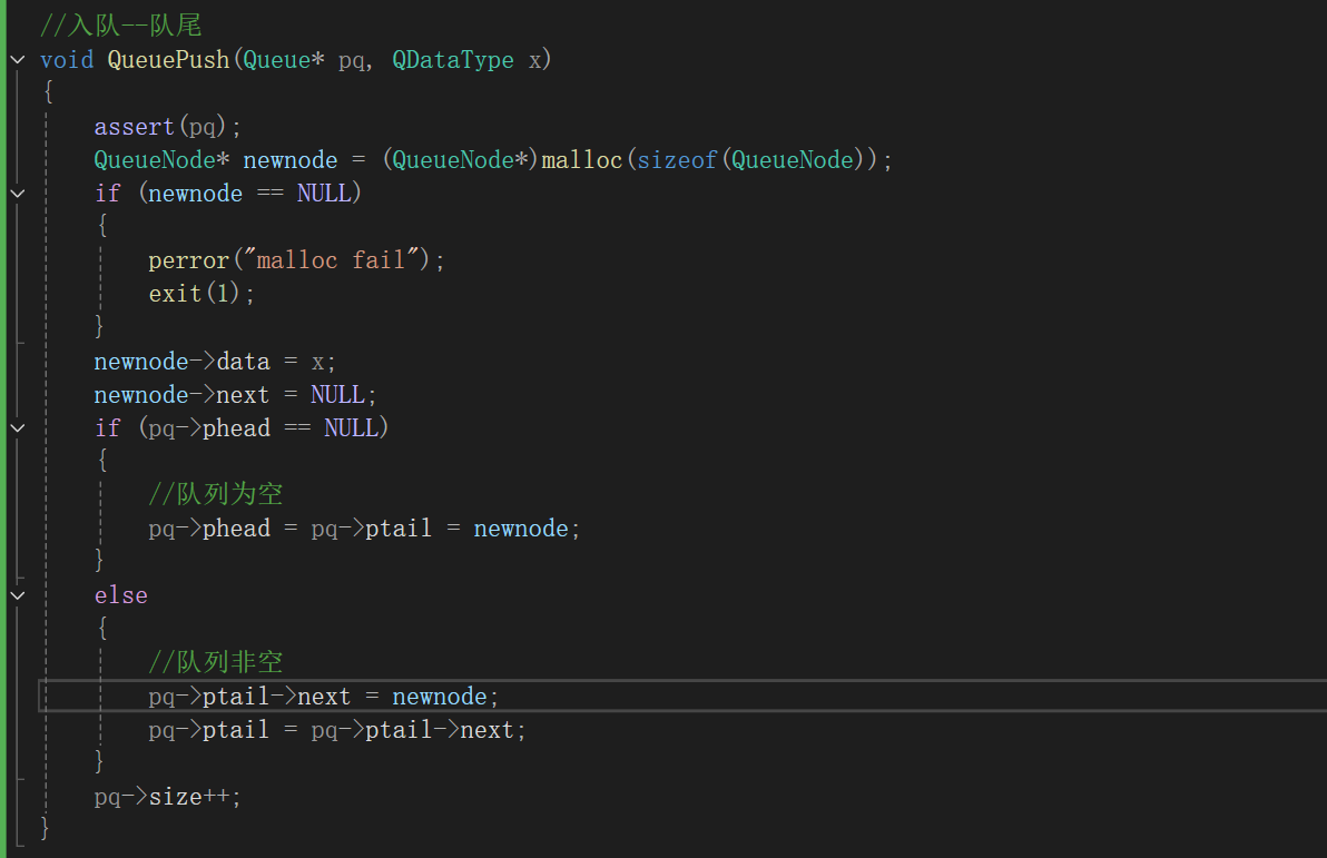 这里就需要用到结构体嵌套的知识点了,假设队列的结构中我们只关注两个结点,一个头结点,一个尾结点,这样入队的操作直接使用尾结点。