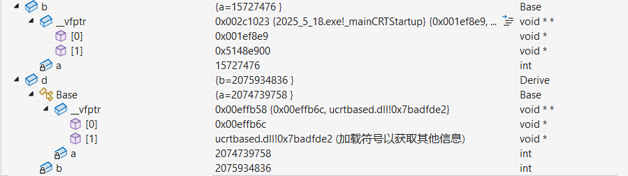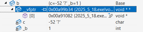 可以到b变量存储空间里面,最上面存储了一个指针,下面才是b的成员变量。