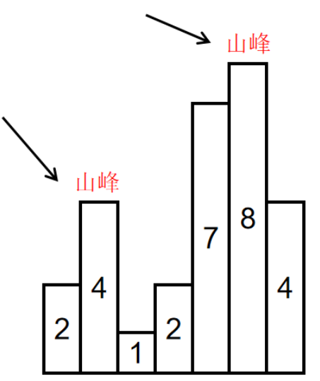 如输入[2,4,1,2,7,8,4]时,会形成两个山峰,一个是索引为1,峰值为4的山峰,另一个是索引为5,峰值为8的山峰,如下图所示: