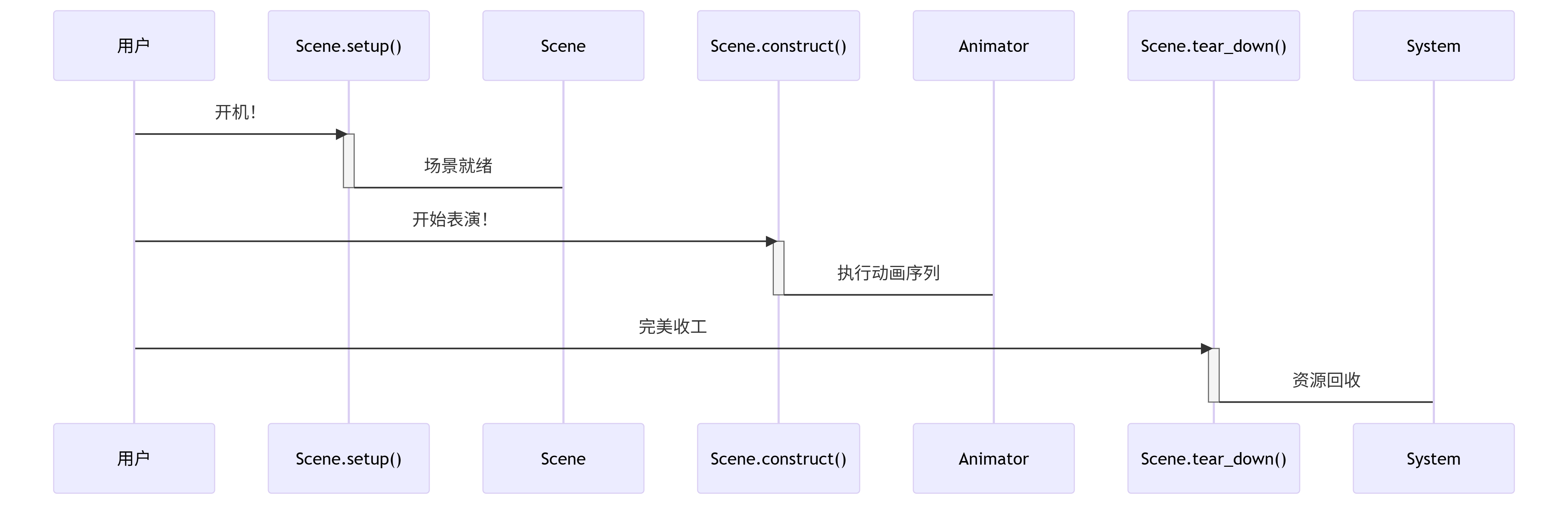其中,Scene.setup()为动画做好开场准备,Scene.construct()定义了动画的核心内容,而Scene.tear_down()则完成了动画的收尾工作。