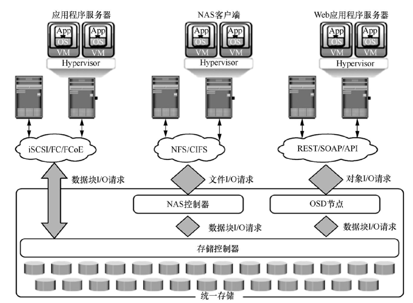 统一存储系统指的是一个存储控制器可以应对不同类型的存储需求。在统一存储系统中,对存储的数据块、文件和对象等的I/O请求通过不同的I/O路径传输。