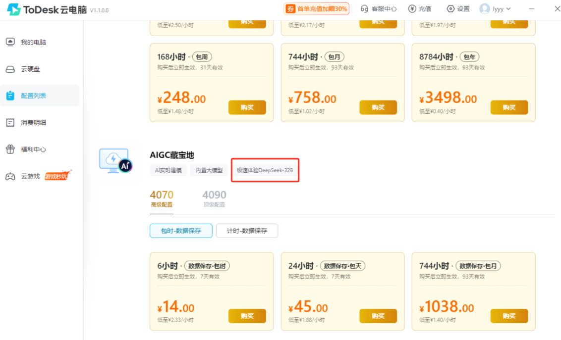| ToDesk(4090) | 2.83元 | 128元/30小时 | 首充加赠30% | 专业设计师、AI开发者 |