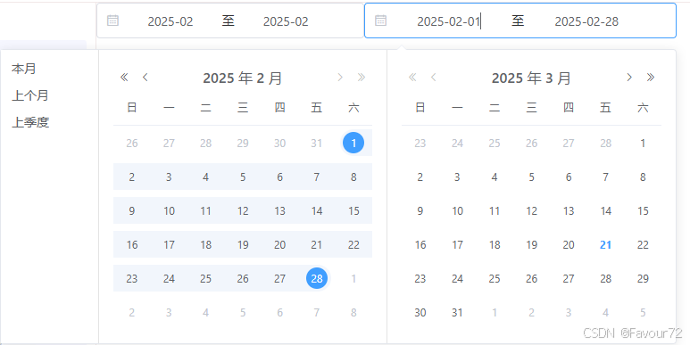 <el-date-picker v-model="value" type="monthrange" align="right" unlink-panels range-separator="至"