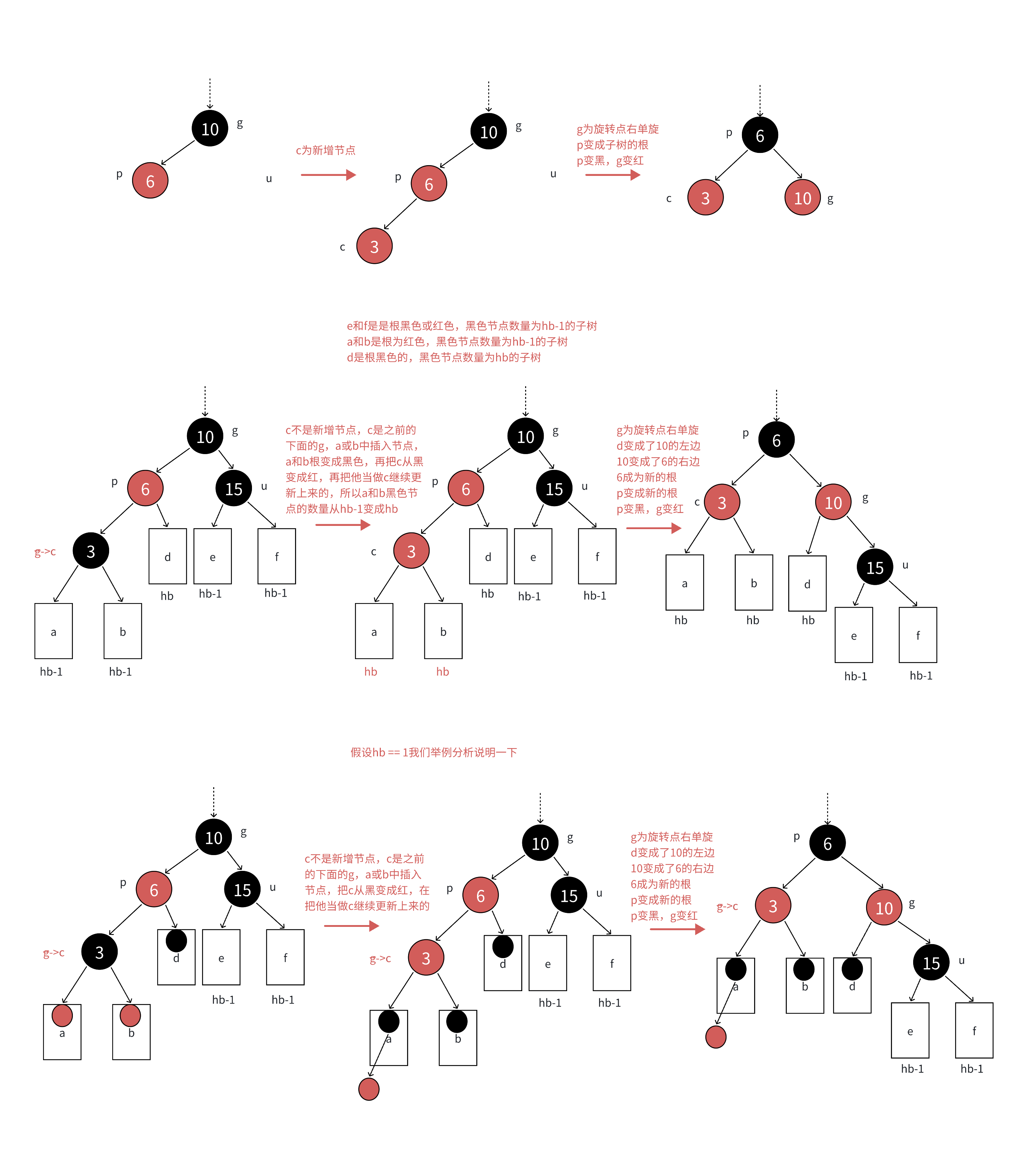 下面几种情况,c 都是为红色,因为我们新插入的节点都是红色的,并且我们在向上更新时,更新后的爷爷节点如果为黑色的话,它的父亲节点无论为红还是黑都不会影响规则。所以下面的几种情况 c 都是红色。