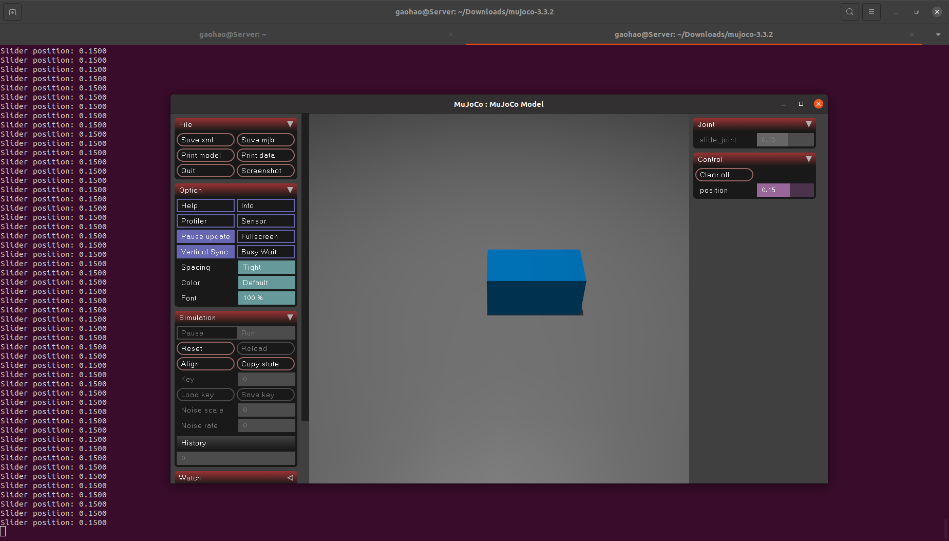 上面的代码核心就是这句 mujoco.mj_resetData(model, data) ,运行后每隔 5s 就会重置一次环境,滑块会瞬间跳回到初始位置。