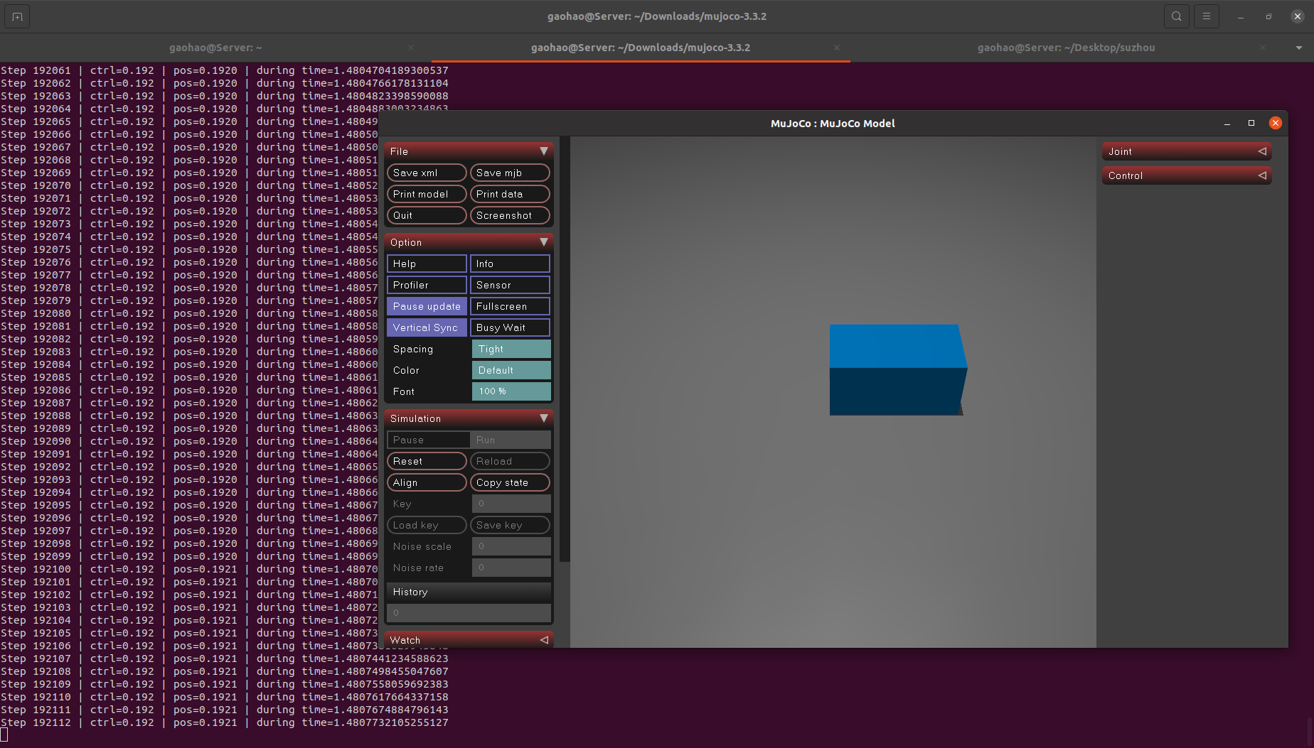 后面的绝大多数实验会在 GPU 服务器上运行,GPU 服务器通常不会有 GUI 相关的可执行文件,mujoco 实现无 GUI 运行也非常简单,下面这个例子就写了一个循环,当超时后自动结束仿真: