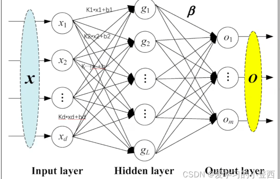 - 隐藏层与输出层之间的连接线上标有 β \beta β ,表示隐藏层到输出层的权重 。隐藏层神经元的输出与这些权重进行加权求和,得到输出层神经元的最终输出,用于完成预测任务,如回归或分类任务。
