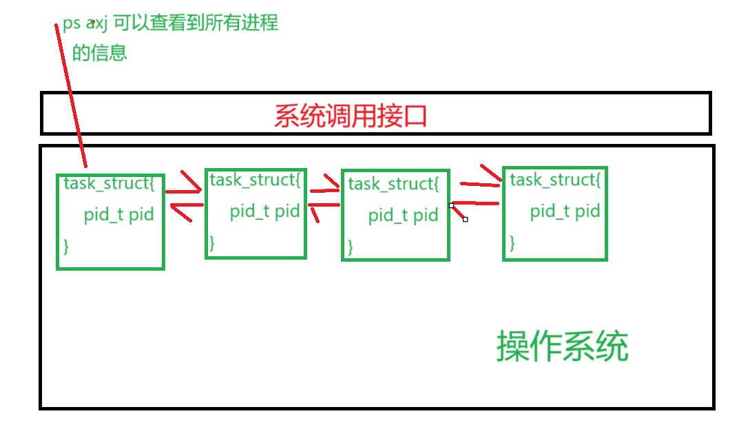 Linux操作系统中,描述系统进程的task_struct是用双向链表组织的ps ajx的作用,相当于遍历task_struct的链表,拿到所有进程的相关属性 ,打印出来,供我们查看PID- 既然可以拿到所有进程 的相关属性,那么对于一个特定进程的PID,应当也是可以获取到的