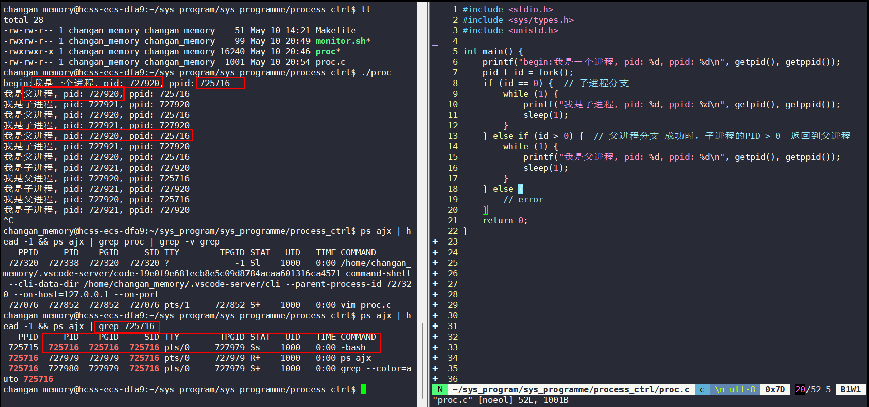 printf("我是子进程, pid: %d, ppid: %d\n", getpid(), getppid());