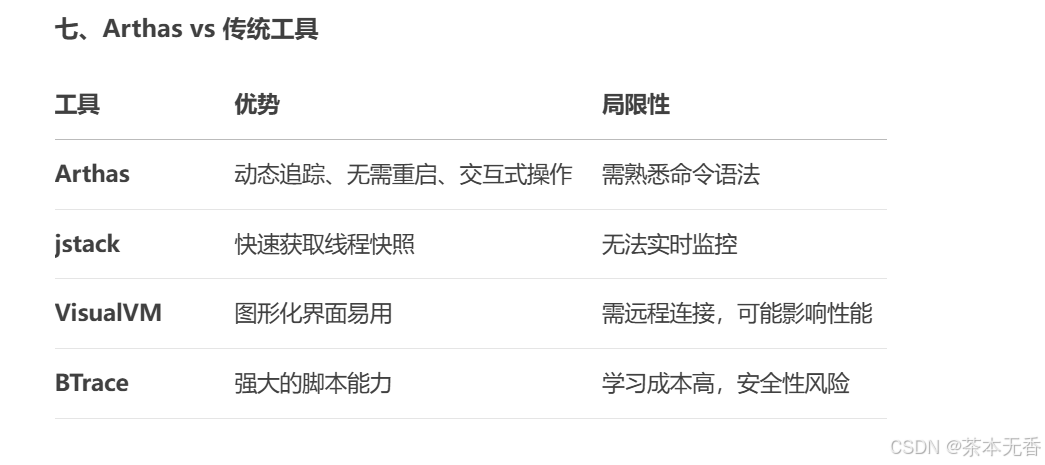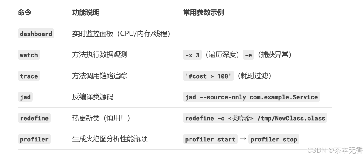 b\] 在方法调用之前观察 \[e\] 在方法异常之后观察 \[s\] 在方法返回之后观察 \[f\] 在方法结束之后(正常返回和异常返回)观察 \[E\] 开启正则表达式匹配,默认为通配符匹配 \[x:\] 指定输出结果的属性遍历深度,默认为 1 打印类的详细信息: sc -d com.***.class(包+类) 打印出类的Field信息: sc -d -f com.*** .class(包+类) 打印出类的Field信息,遍历深度为2: sc -d -f com.\*\*\*.class(包+类) -x 2 sc的几个参数的说明: \[d\] 输出当前类的详细信息,包括这个类所加载的原始文件来源、类的声明、加载的ClassLoader等详细信息。 如果一个类被多个ClassLoader所加载,则会出现多次 \[E\] 开启正则表达式匹配,默认为通配符匹配 \[f\] 输出当前类的成员变量信息(需要配合参数-d一起使用) \[x:\] 指定输出静态变量时属性的遍历深度,默认为 0,即直接使用 toString 输出 7、 quit------退出当前 Arthas 客户端,其他 Arthas 客户端不受影响 stop------关闭 Arthas 服务端,所有 Arthas 客户端全部退出 如果只是退出当前的连接,可以用quit或者exit命令。Attach 到目标进程上的 arthas 还会继续运行,端口会保持开放,下次连接时可以直接连接上。 如果想完全退出 arthas,可以执行stop命令。生产环境里,一定要使用stop命令!、 场景2:内存泄漏排查 1. 导出堆内存快照 heapdump --live /tmp/heapdump.hprof 2. 统计对象实例数 ognl '@com.example.LeakyClass@instanceCount' 3. 追踪大对象创建路径 stack com.example.LeakyClass "" 场景3:动态修改日志级别 查看当前Logger配置 logger ## 修改ROOT日志级别为DEBUG logger --name ROOT --level DEBUG 四、核心命令速查表  五、生产环境最佳实践 安全第一 优先使用watch/trace等只读命令,避免redefine热更新引发稳定性问题。 诊断完成后务必执行stop彻底退出,防止残留连接占用资源。 性能影响控制 限制监控次数(-n 5)和遍历深度(-x 3)。 避免对高频方法(如核心交易链路)进行持续监控。 日志与记录 使用history -w /path/to/log保存操作历史。 结合tee命令同时输出到文件和屏幕: trace com.example.Service \* \| tee /tmp/trace.log 六、Arthas 进阶技巧 1. 批量执行命令 ## 通过脚本执行多个命令 java -jar arthas-boot.jar -c "watch com.example.Service method; thread -n 3" 2. 结合Ognl表达式 ## 调用静态方法获取系统配置 ognl '@com.example.ConfigUtils@getConfig("timeout")' ## 修改静态变量(谨慎!) ognl '@com.example.GlobalConfig@DEBUG_MODE=true' 3. 火焰图分析 ## 启动采样(默认持续30秒) profiler start ## 生成HTML格式火焰图 profiler stop --format html  结语 Arthas 的核心理念是\*\*"看得见的问题才是好问题"\*\*。通过本文的实战指南,开发者可以快速掌握从基础监控到深度诊断的全链路技巧。无论是日常开发中的性能调优,还是凌晨三点的紧急故障排查,Arthas 都能成为你手中最锋利的"瑞士军刀"。 附录: Arthas 官方文档 Arthas 实战案例集