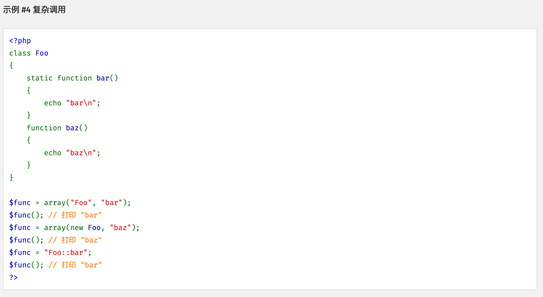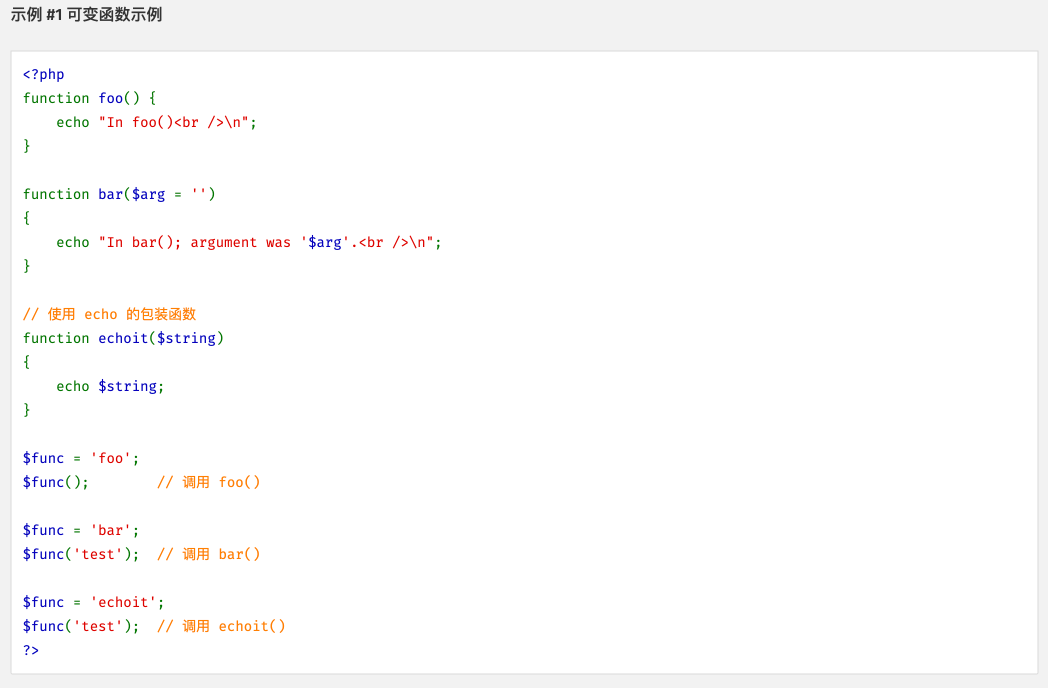可变函数不能用于例如echo,print,unset(),isset(),empty(),include,require以及类似的语言结构。需要使用自己的包装函数来将这些结构用作可变函数