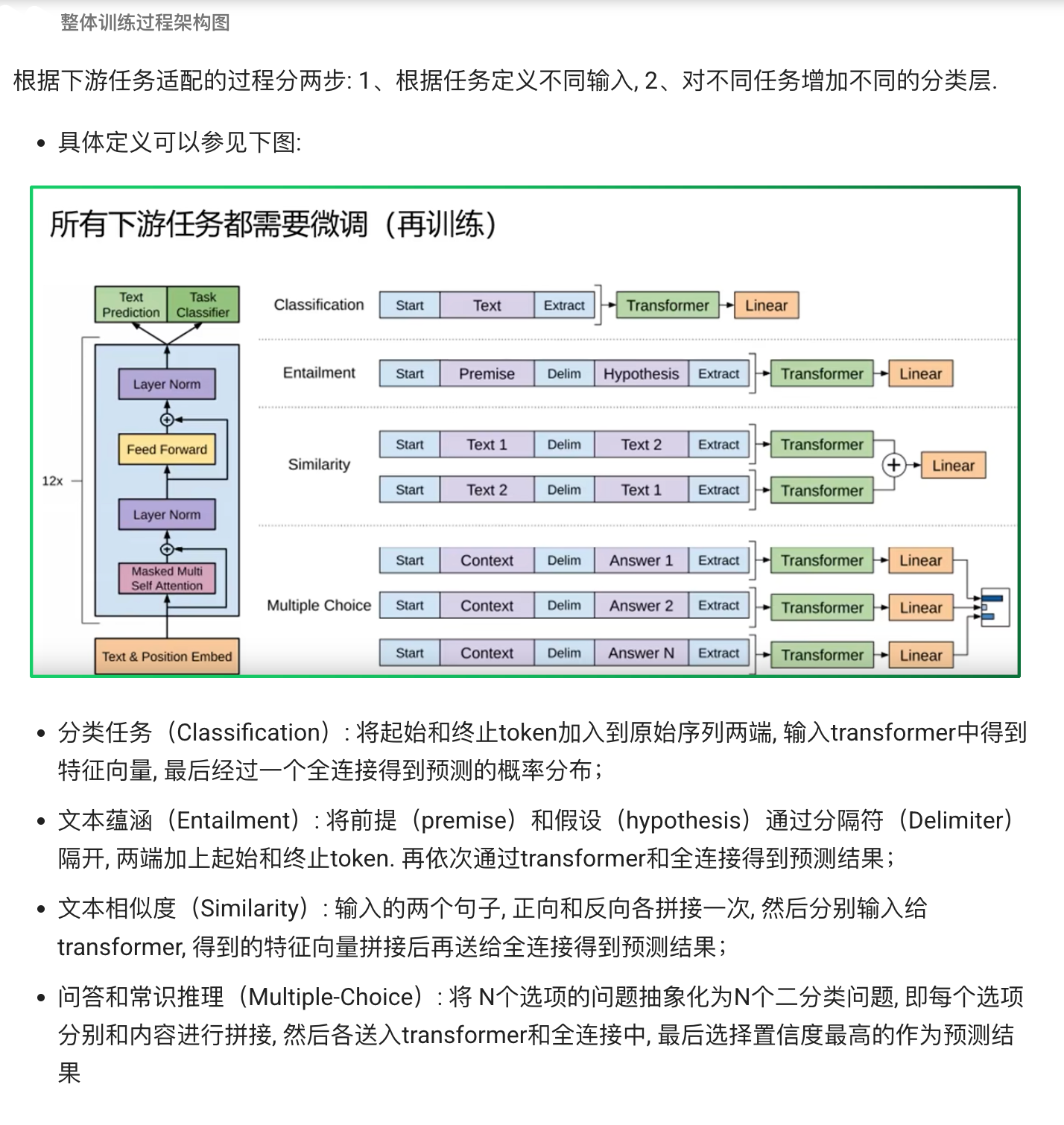 核心思路 :不管你要做什么任务,都用同一个 Transformer(这里是 GPT/Decoder-Only 模型)当"特征抽取器",只需在输入端"拼"出不同格式的 token 序列(加上 Start/Delim/Extract),在输出端接上不同的 小头(task‐specific head),微调时只训练这部分新加层(当然也可以微调部分 Transformer 层)。