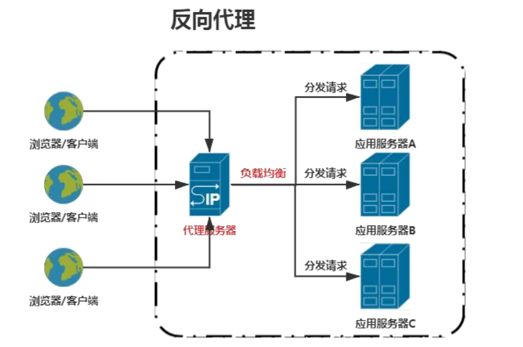 反向代理,指的是浏览器/客户端并不知道自己要访问具体哪台目标服务器,只知道去访问代理服务器 ,代理服务器再通过反向代理 +负载均衡实现请求分发到应用服务器的一