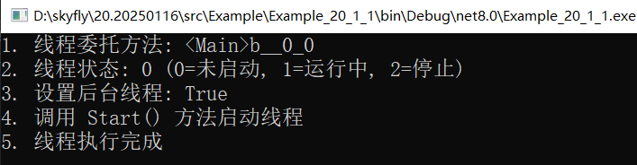 Console.WriteLine($"2. 线程状态: {threadState} (0=未启动, 1=运行中, 2=停止)");