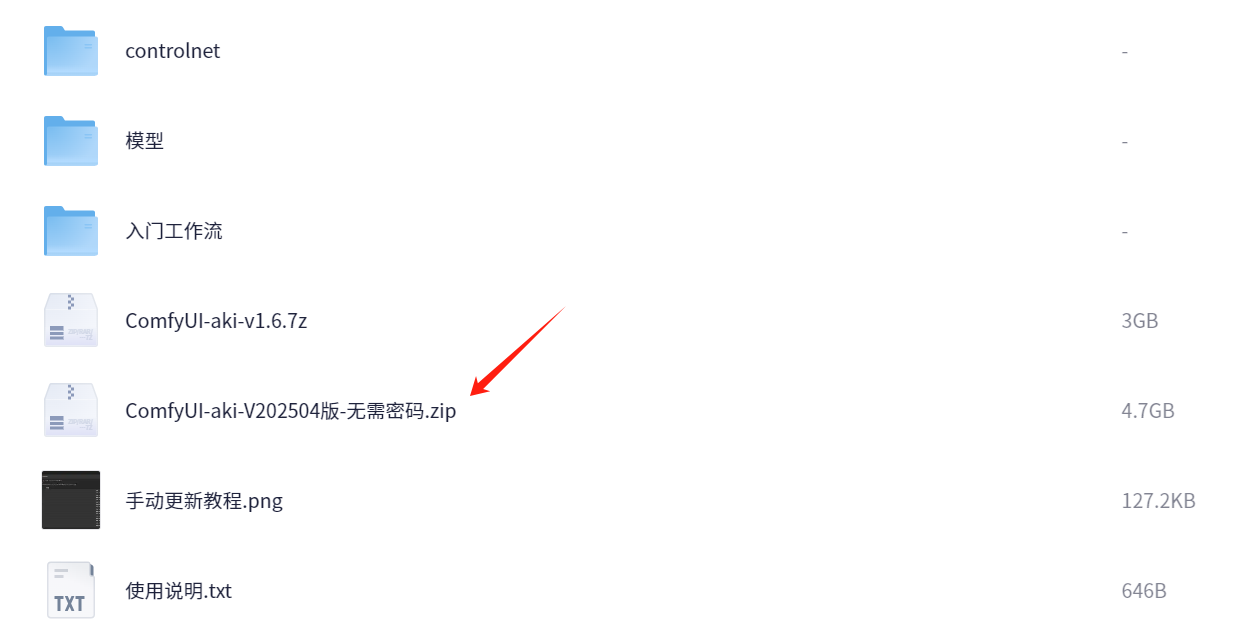 打开链接,只需要下载ComfyUI-aki-V202504版-无需密码.zip,其他文件不需要下载。