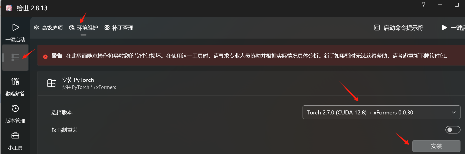 点击左侧的高级选项-->环境维护-->安装PyTorch,选择最新版本CUDA 12.8,点击安装。