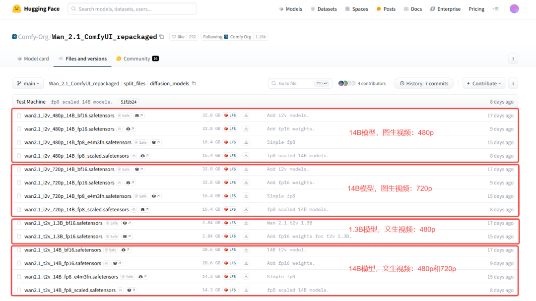 Wan2.1模型支持文生视频和图生视频两种方式,每种方式下又有14B和1.3B两种尺寸的模型,其中:
