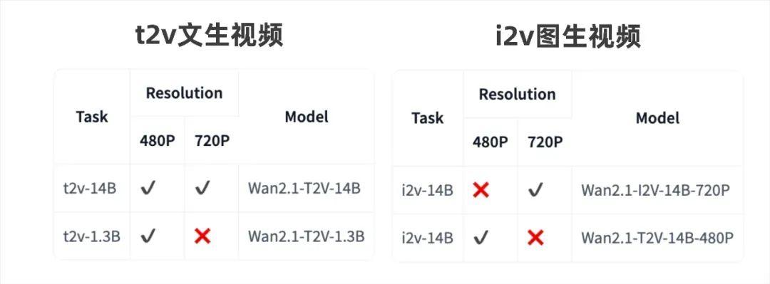 其中,文生视频模型有1.3B和14B两种大小,图生视频模型大小都是14B,不过,一个是480P,另一个是720P。