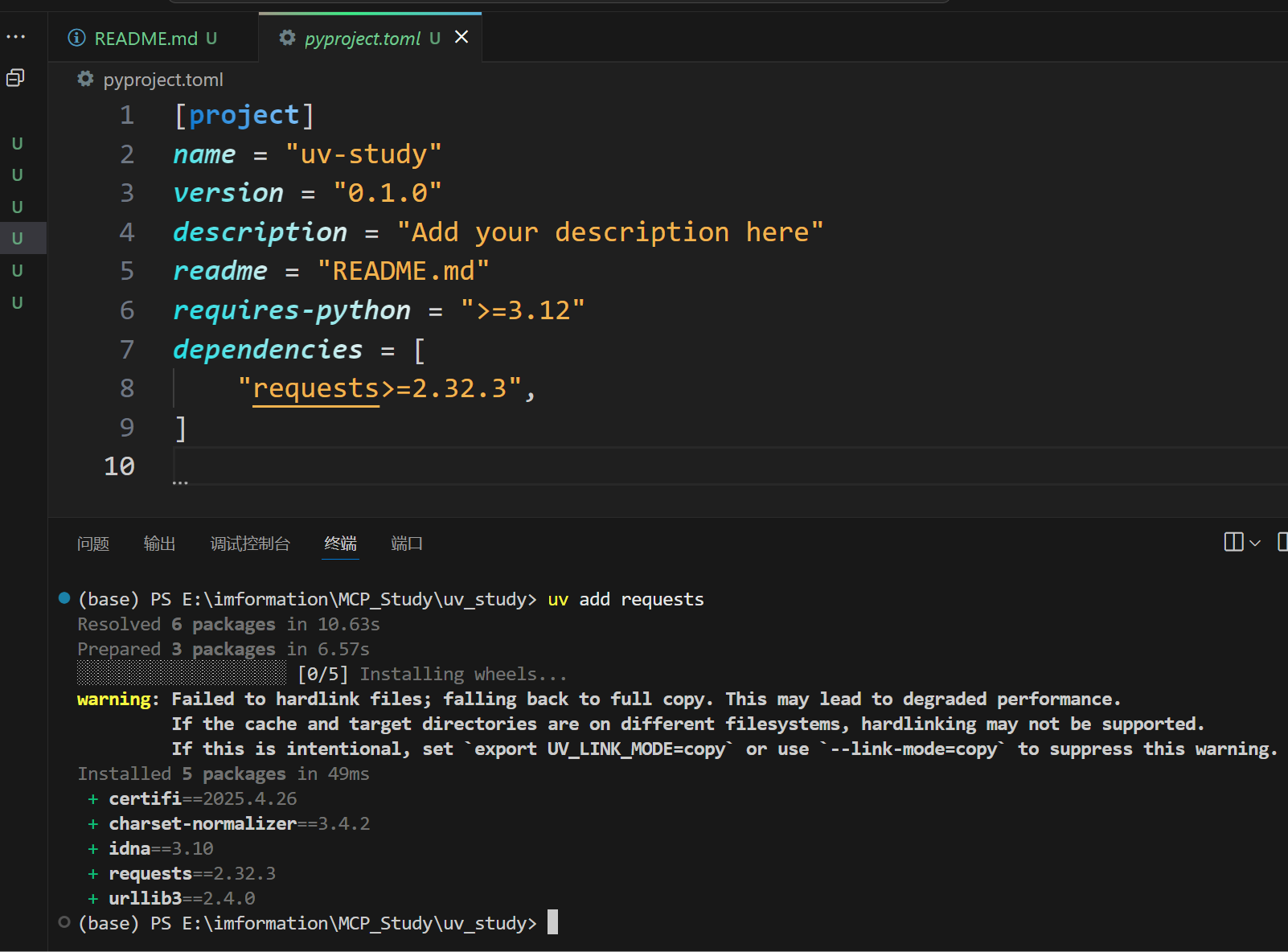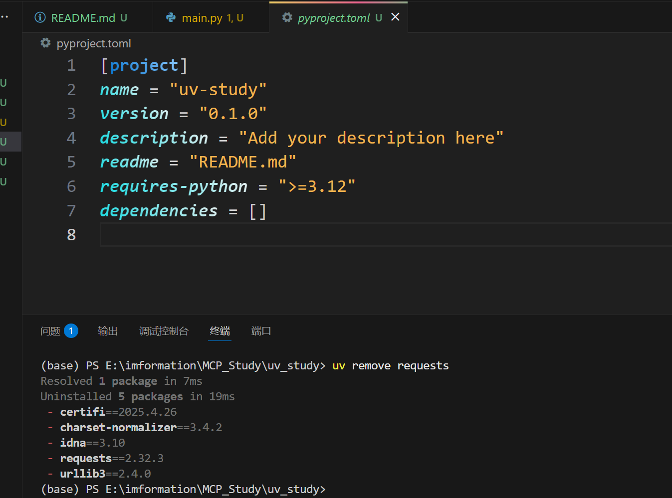 要想在这个环境中添加依赖库,只需要使用uv add命令即可。(当然得在对应的项目目录下)