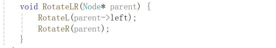 这个就是左右旋转了,我们可以看到是失衡节点的左子树的右子树导致的,此时我们通过单旋是无法完成的,此时就需要用左右旋转了,我直接来说是怎么旋转的吧,我也教大家一个方法记一下,左子树的右子树导致失衡的,就是LR型的,L是左吗,所以就是先让失衡节点的左孩子左旋,再让失衡节点右旋即可。
