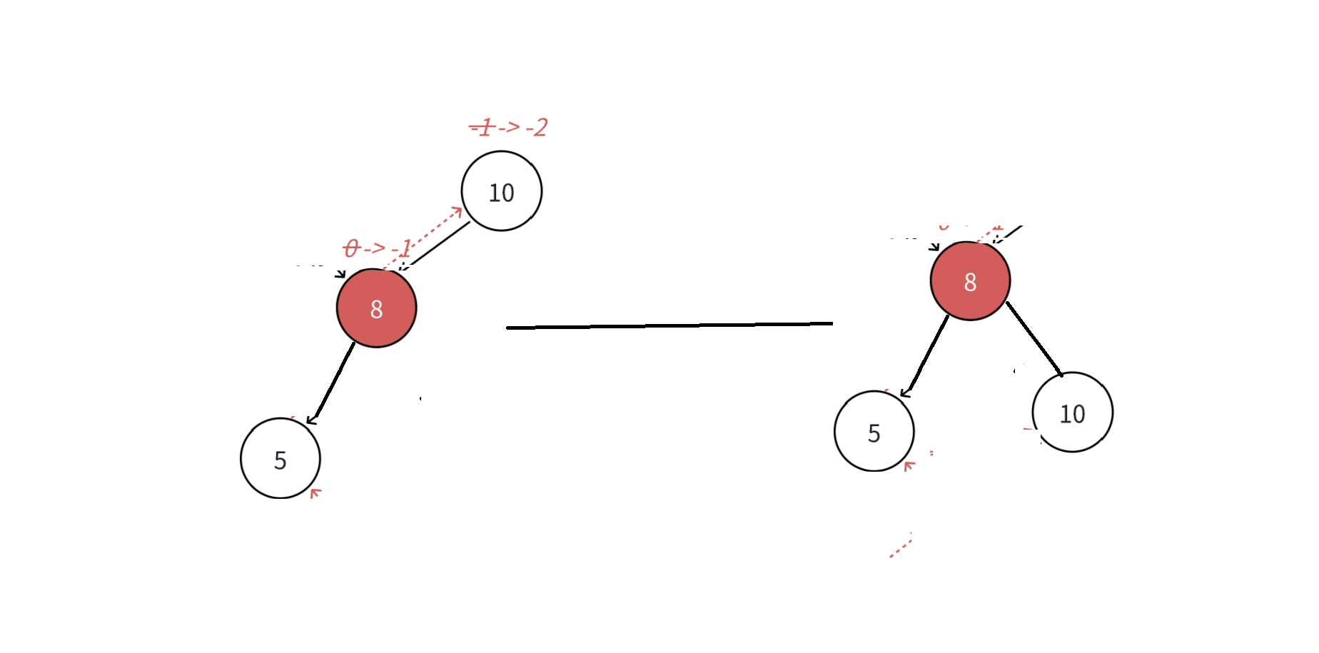 衡因⼦从-1变成-2,10为根的树左右⾼度差超过1,违反平衡规则。10为根的树左边太⾼了,需要