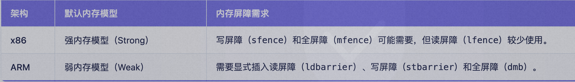 不同处理器架构对内存屏障的支持和实现方式不同。以下是两种常见架构的对比:
