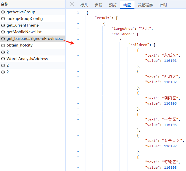 **负载:**对于POST请求:负载通常包含了传递的参数,这里我们可以看到它的传参包括各级行政区名称,是明文传输;